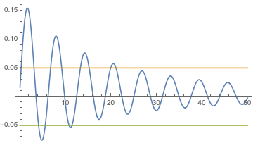 Alla värden på \(\omega\) som är större än \(\approx 21\) kommer att ha egenskapen att \(x > \omega\) medför att \(f(x)\) ligger mellan de två horisontella linjerna. Av de givna alternativen är därför 30, 40, 50 korrekta val, medan 10 och 20 inte duger.
