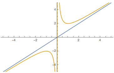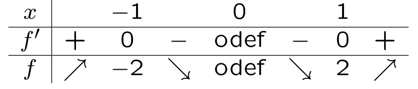 Funktionen är definierad, kontinuerlig och godtyckligt många gånger deriverbar på hela $\mathbb{R}$ med undantag av origo. Vi observerar också att $f(x)$ är udda. $f$ har en lodrät asymptot $x=0$ och en sned (tvåsidig) asymptot $y=x$.\[ f'(x)=1-\dfrac1{x^2}=0\Leftrightarrow x=\pm 1,\]ger teckentabellenVi har alltså en lokal maxpunkt i $(-1,-2)$ och en lokal minpunkt i $(1,2)$. $f$ antar alla värden i intervallet $]-\infty,\infty[$ med undantag för intervallet $]-2,2[$. Alltså är $V_f=]-\infty,-2] \cup [2,\infty[$.$f''(x)=2x^{-3}$, vilket ger att funktionen är konkav på $]-\infty,0[$ och konvex på $]0,\infty[$ (ingen inflexionspunkt).