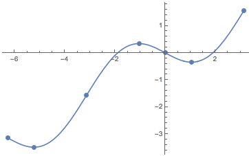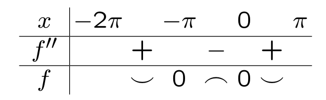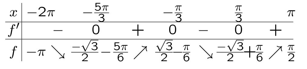 Funktionen är definierad, kontinuerlig och godtyckligt många gånger deriverbar på hela intervallet. Vi observerar att $f(x)$ är udda, fast intervallet är asymmetriskt.\[f(x)=\dfrac12 x-\sin x \Rightarrow f'(x)=\dfrac12 -\cos x.\]$f'(x)$ har nollställena $-\dfrac{5\pi}{3}$, $-\dfrac{\pi}{3}$ och $\dfrac{\pi}{3}$, vilket ger följande teckentabell:Vi har två lokala minpunkter i $-\dfrac{5\pi}{3}$ och $\dfrac{\pi}{3}$, varav $-\dfrac{5\pi}{3}$ uppenbarligen är den globala minpunkten med minvärde $-\dfrac{\sqrt3}{2}\!-\!\dfrac{5\pi}{6}$. Vi har tre lokala maxpunkter, $-2\pi$, $-\dfrac{\pi}{3}$ och $\pi$, varav två är randpunkter. Tydligen är $\pi$ den lokala maxpunkten med maxvärde $\dfrac{\pi}{2}$. För andraderivatan $f''(x)=\sin x$ fås tydligen två nollställen i det inre, nämligen $-\pi$ och $0$. Vi får följande teckentabell$f(x)$ är konvex på intervallen $[-2\pi,-\pi]$ och $[0,\pi]$, och konkav på intervallet $[-\pi,0]$.
