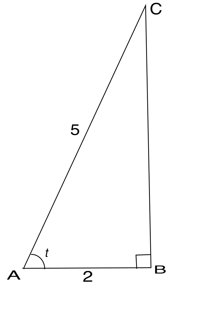 För att bestämma $\sin t$ måste vi först beräkna höjden $h$ ($=|BC|$). Pythagoras sats ger att $h^2+2^2=5^2$, dvs. $h=\sqrt{25-4}=\sqrt{21}$. Alltså blir $\sin t=\dfrac{\sqrt{21}}{5}$.