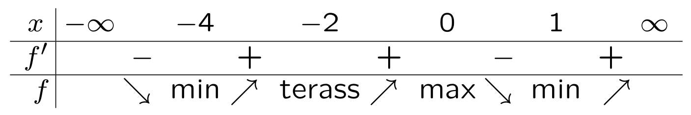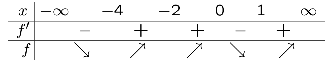 Funktionen har 3 lokala extrempunkter, varav 1 är en lokal maxpunkt (i $0$) och 2 är lokala minpunkter (i $-4$ och $1$), se figuren nedan. (Dessutom finns det en terasspunkt i $-2$.)
