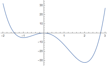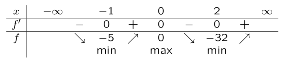 Bestäm alla kritiska punkter till funktionen \[ f(x)=3x^4-4x^3-12x^2, \] samt avgör deras karaktär. Räkna upp de kritiska punkterna i växande ordning, separerade av kommatecken. Ange även dessas karaktär i motsvarande ordning. Karaktär anges med "min", "max" eller "terrass", separerade med kommatecken.