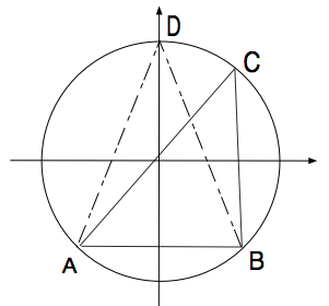Skiss av beviset: Det räcker att visa att det för varje inskriven triangel finns en inskriven likbent triangel med minst lika stor area. Då följer det ju att maximum av areorna av alla inskrivna trianglar är mindre än eller lika med maximum av areorna av alla inskrivna likbenta trianglar. Den omvända olikheten är självklar, eftersom mängden av likbenta inskrivna trianglar är en delmängd av mängden av alla inskrivna trianglar. En godtycklig inskriven triangel $\triangle ABC$ kan alltid vridas (med bibehållen area) så att sidan $AB$ är parallell med $x$-axeln. Vi ser nu att arean av $\triangle ABC$ blir mindre än arean av den likbenta $\triangle ABD$ (se figur) där hörnet $D$ ligger i punkten $(0,1)$, eftersom höjden av den likbenta triangeln där blir maximal.