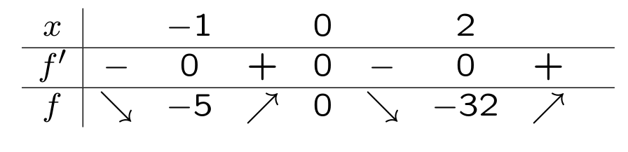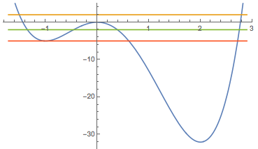 Vi gör en enkel grafritning. \[p'(x)=12x^3-12x^2-24x=12x(x-2)(x+1),\]vilket ger teckentabellenUr bilden kan vi nu avläsa att: a) Det finns två rötter för $a=2$ (den gula linjen skär grafen i två punkter). b) Det finns fyra rötter för $a=-2$ (den gröna linjen skär grafen i fyra punkter). c) Det finns tre rötter för $a=-5$ (den gula linjen skär grafen i tre punkter).